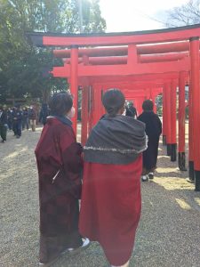 母と妻、息子と娘に私をあわせて5人全員がきもの姿で地元の神社にお参りに行きました