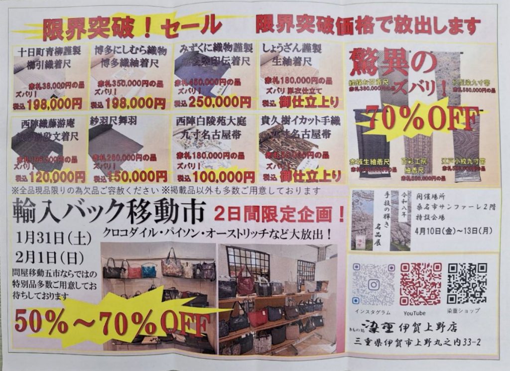 ※上記チラシ掲載品の価格は伊賀上野店のみの特別価格となります。他の染重店舗では同一価格でのご提供はいたしませんのでご注意下さい。※