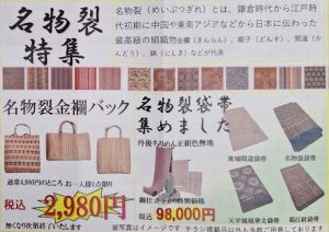 人気の「名物裂」の柄を用いた帯や色無地、バッグまで。
